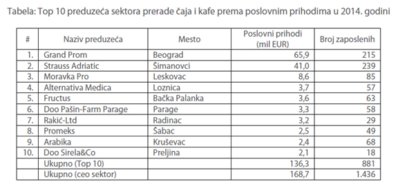 U tabeli ispod prikazano je 10 najvećih preduzeća rangiranih prema poslovnim prihodima u 2014. godini. Ova preduzeća proizvode tradicionalnu, instant kafu, espreso, čaj od nane, kamilice, hibiskusa, šipka, aronije, brusnice, itd.