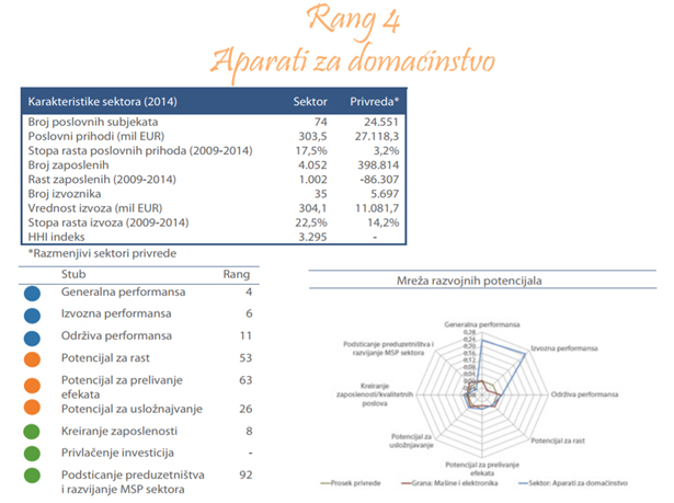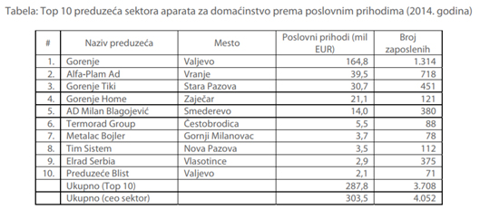 U tabeli ispod prikazano je 10 najvećih firmi, rangiranih prema poslovnim prihodima u 2014. godini. Ova preduzeća imaju širok asortiman proizvoda, među kojima spadaju mali (pegle, vage, mikseri...) i veliki (mašine za pranje i sušenje veša, frižideri, zamrzivači...) kućni aparati, kamini, razne vrste peći, bojleri, grejalice, klima uređaji i ostali sitni električni aparati.
