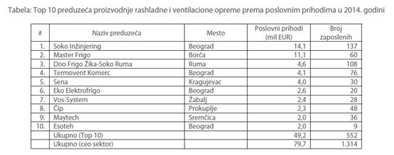 U tabeli ispod prikazano je 10 najvećih preduzeća rangiranih prema poslovnim prihodima u 2014. godini. Ova preduzeća proizvode opremu za klimatizaciju i hlađenje: klima uređaje, klima komore, klima ormane, rashladne komore, agregate, ventilatore, sve vrste rashladne, termičke i neutralne opreme i agregate, frižidere, zamrzivače, itd.