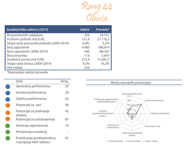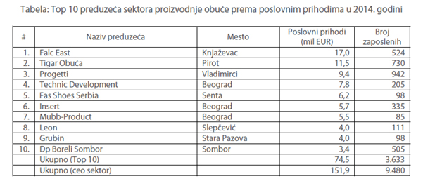 Sektor proizvodnje obuće obuhvata proizvodnju različite vrste obuće od kože, plastike, tekstila i gume. U tabeli ispod prikazano je 10 najvećih preduzeća rangiranih prema poslovnim prihodima u 2014. godini. Ova preduzeća proizvode plitke, duboke cipele, čizme, patike, štikle, platforme, papuče, klompe, japanke, sandale, anatomske uloške, itd.