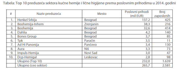 Sektor kućne hemije i lične higijene obuhvata proizvodnju parfema i toaletnih preparata i proizvodnju deterdženata, sapuna, sredstava za čišćenje i poliranje. Ove delatnosti obuhvataju sledeće proizvode: parfeme i toaletne vode, preparate za ulepšavanje i negu kože, kreme za sunčanje, preparate za kosu, dentalnu higijenu, za brijanje, sapune, kreme i sredstva za poliranje obuće, podova, stakla ili metala, itd. U tabeli ispod prikazano je 10 najvećih preduzeća rangiranih prema poslovnim prihodima u 2014. godini.