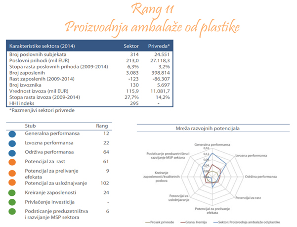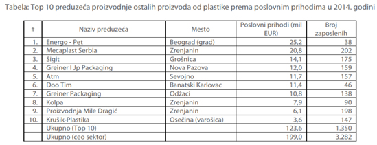 Sektor proizvodnje ambalaže od plastike obuhvata proizvodnju velikog broja proizvoda od plastike koji služe za pakovanje, kao što su posude, poklopci, zatvarači, itd. U tabeli ispod prikazano je 10 najvećih preduzeća rangiranih prema poslovnim prihodima u 2014. godini. Ova preduzeća proizvode plastične folije, čaše za mlekarsku industriju, haube za palete, kese (biorazgradive i reklamne), ambalažu za prehrambenu i neprehrambenu industriju, kutije, poklopce, itd.