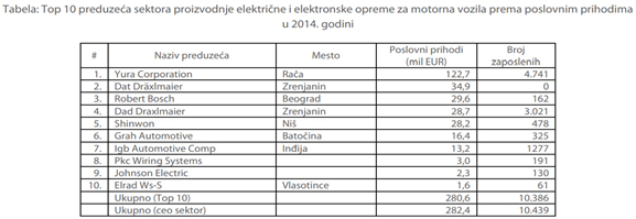 Proizvodnja električne i elektronske opreme za motorna vozila obuhvata proizvodnju velikog broja električnih i elektronskih proizvoda za upotrebu u motornim vozilima. U tabeli ispod prikazana su najveća preduzeća u Srbiji, koja se bave proizvodnjom električne i elektronske opreme za motorna vozila. Ova preduzeća proizvode električnu opremu za paljenje i pokretanje motora sa unutrašnjim sagorevanjem (magneta za paljenje, dinamo-magneta, kalemova za paljenje, svećica za paljenje i zagrevanje...), brisače i uređaje za odmrzavanje i odmagljivanje, električne naprave za otvaranje prozora i vrata na automobilima, setove (garnitura) provodnika, regulatore voltaže, itd.