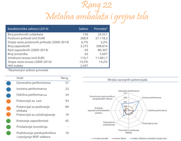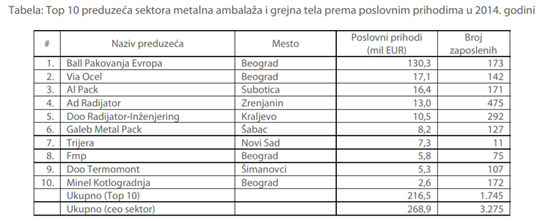 Sektor metalne ambalaže i grejnih tela obuhvata proizvodnju parnih kotlova i radijatora za centralno grejane, proizvodnju ostalih metalnih cisterni, rezervoara i kontejnera. Firme ovog sektora proizvode rezervoare, cisterne, bačve, od gvožđa, čelika ili aluminijuma, limenke, kutije i slične kontejnere.