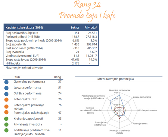 Sektor prerada čaja i kafe obuhvata prženje kafe, ekstrakte, esencije i koncentrate kafe i čaja.