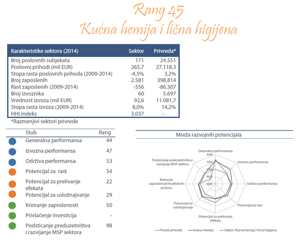 Sektor kućne hemije i lične higijene obuhvata proizvodnju parfema i toaletnih preparata i proizvodnju deterdženata, sapuna, sredstava za čišćenje i poliranje. Ove delatnosti obuhvataju sledeće proizvode: parfeme i toaletne vode, preparate za ulepšavanje i negu kože, kreme za sunčanje, preparate za kosu, dentalnu higijenu, za brijanje, sapune, kreme i sredstva za poliranje obuće, podova, stakla ili metala, itd. U tabeli ispod prikazano je 10 najvećih preduzeća rangiranih prema poslovnim prihodima u 2014. godini.