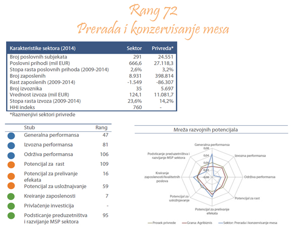 Sektor prerade i konzervisanja mesa obuhvata meso goveda, meso ovaca ili koza, meso svinja, meso konja, magaraca, mula ili mazgi, sveže, rashlađeno ili smrznuto, meso i klanični proizvodi za jelo, sveže, rashlađeno ili smrznuto, iznutrice, riblje meso (mleveno ili ne), itd.