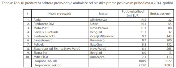 Sektor proizvodnje ambalaže od plastike obuhvata proizvodnju velikog broja proizvoda od plastike koji služe za pakovanje, kao što su posude, poklopci, zatvarači, itd. U tabeli ispod prikazano je 10 najvećih preduzeća rangiranih prema poslovnim prihodima u 2014. godini. Ova preduzeća proizvode plastične folije, čaše za mlekarsku industriju, haube za palete, kese (biorazgradive i reklamne), ambalažu za prehrambenu i neprehrambenu industriju, kutije, poklopce, itd.
