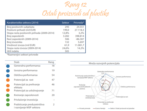 Sektor proizvodnje ostalih proizvoda od plastike obuhvata proizvodnju proizvoda kao što su veštačka creva (za kobasice i viršle) i ostalih proizvoda od plastike. U tabeli ispod prikazano je 10 najvećih preduzeća rangiranih prema poslovnim prihodima u 2014. godini. Ova preduzeća proizvode boce za punjenje vode, osvežavajućih pića, piva, mleka, i hemijskih preparata, posude za odlaganje otpada, posude za domaćinstvo, stadionske stolice, baštenske garniture, balističke zaštitne opreme za telo, balističke i interventne šlemove, balističke ploče, medicinska pomagala.