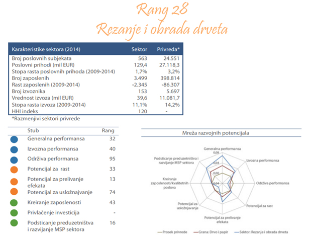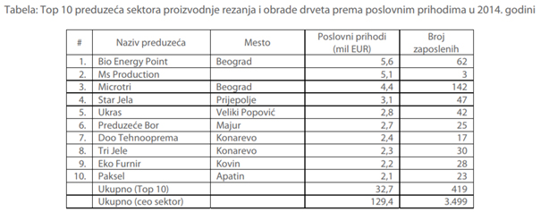 Sektor rezanja i obrade drveta čine delatnosti rezanja i obrade drveta i obuhvata proizvodnju različitih oblika drveta ili drvenih čestica, železničkih ili tramvajskih pragova, drvo četinarskih vrsta i drvo nečetinarskih vrsta. U tabeli ispod prikazano je 10 najvećih preduzeća rangiranih prema poslovnim prihodima u 2014. godini.