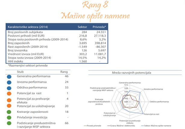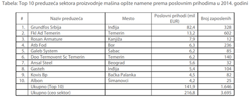Sektor proizvodnje mašina opšte namene obuhvata sledeće delatnosti: proizvodnja motora i turbina, industrijskih peći i gorionika, pumpi i kompresora, ručnih pogonskih aparata sa mehanizmima, proizvodnja ležajeva, zupčanika i zupčastih pogonskih elemenata, proizvodnja slavina i ventila, kancelarijskih mašina i opreme. Ovde spada veliki broj proizvoda, kao npr: parne, gasne i hidraulične turbine, motori sa unutrašnjim sagorevanjem, mašine i aparati za varenje i lemljenje, industrijske peći i gorionici, merne, centrifugalne i vazdušne pumpe, pumpe za gorivo, mašine za pranje suđa, itd. U tabeli ispod prikazano je 10 najvećih preduzeća rangiranih prema poslovnim prihodima u 2014. godini. Ova preduzeća proizvode pumpe za vodosnabdevanje, otpadne vode i vodoprivredu, slavine i ventile, industrijsku armaturu, opremu za rudarstvo, rasute terete i pripremu mineralnih sirovina, motore, pumpe za ulje, reduktore, kancelarijske mašine, itd.