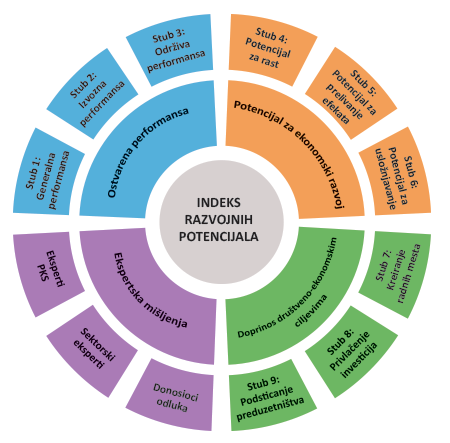 Potencijale sektora merimo pomoću indeksa sastavljenog od četiri glavne komponente: ostvarene performanse, potencijala za ekonomski razvoj, doprinosa društveno-ekonomskim ciljevima i ekspertskih mišljenja. Komponente su komplementarne i sukcesivno pojačavaju efekat jedna drugoj.
